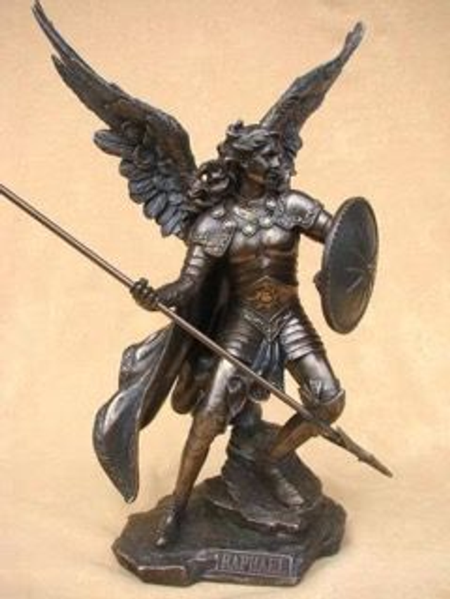 L'archange Raphaël est communément connu pour ses responsabilités en matière de guérison, mais on peut le voir ici portant une armure éthérée, comme s'il partait au combat. Dans sa main droite, il tient une lance, prête à être utilisée, et dans sa gauche, il tient un bouclier. Coulée dans la résine la plus fine avant d'être finie en bronze.