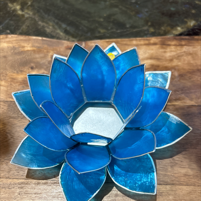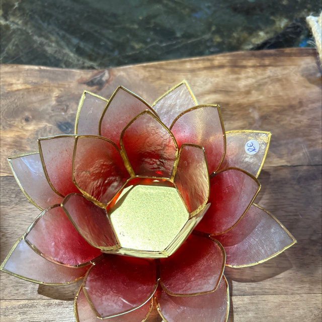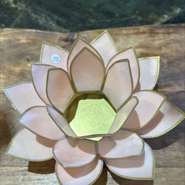 Bougeoir Fleur de lotus blanc, en capiz (coquillage apparenté à l'huître) et métal doré :