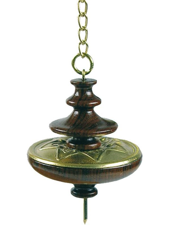 Pendule d'inspiration médiévale fabriqué en bois précieux et corps en laiton repoussé. Forme géométrique basée sur l'étoile à 7 branches. Il permet des recherches en relation avec le sacré, la numérologie, l'astrologie, la magie, l'alchimie, les études sur carrés magiques, textes kabbalistiques... Très haute sensibilité du au déplacement du centre de gravité vers le haut. Il donne des réponses franches et précises car la moindre oscillation est amplifiée.