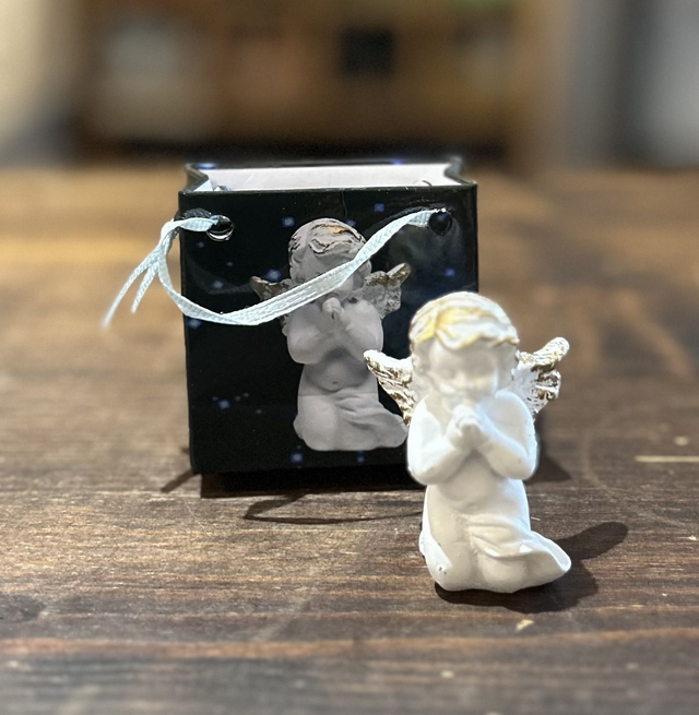 Petit sac cadeau avec joli cordon en satin. Dans ce sac, un petit ange qui prie.